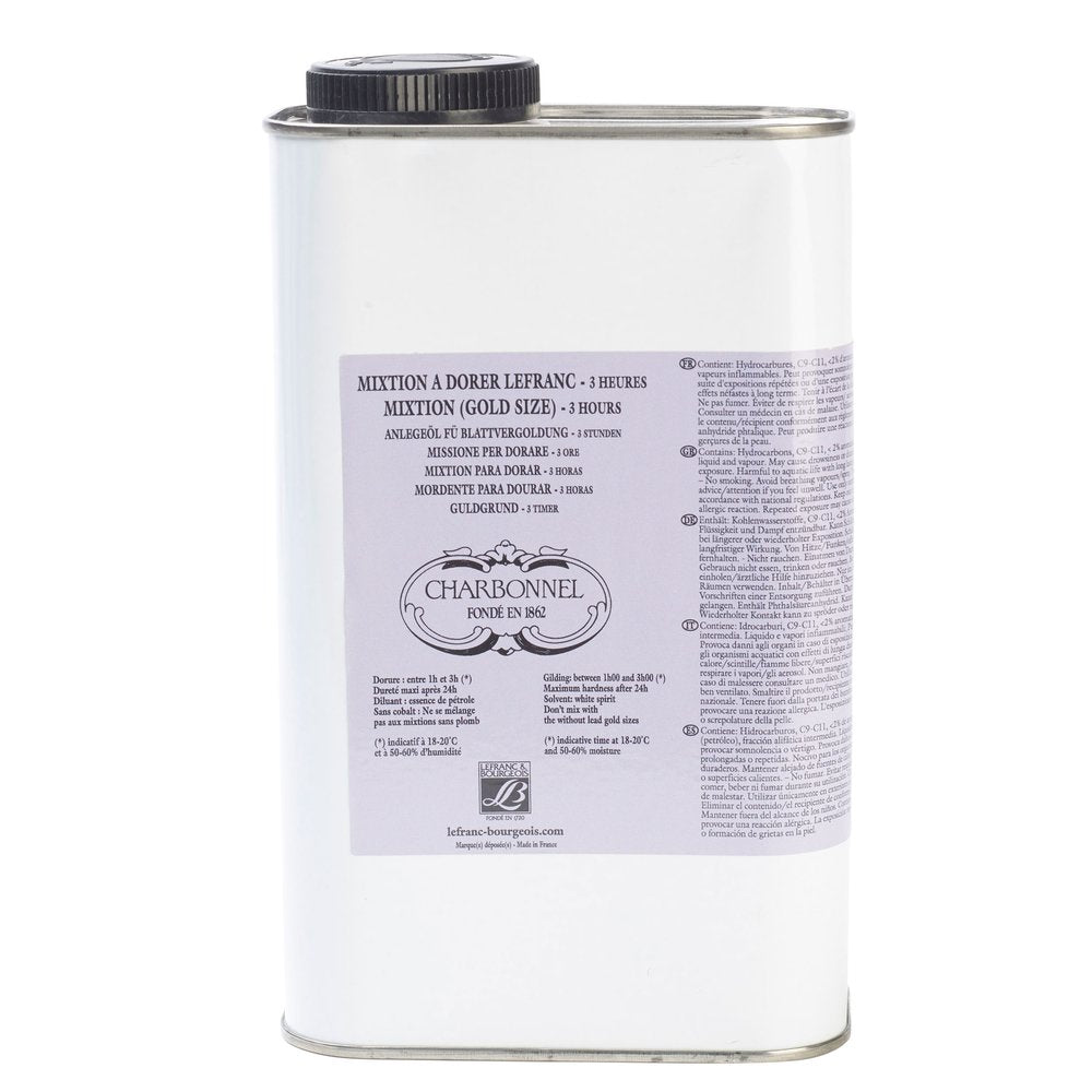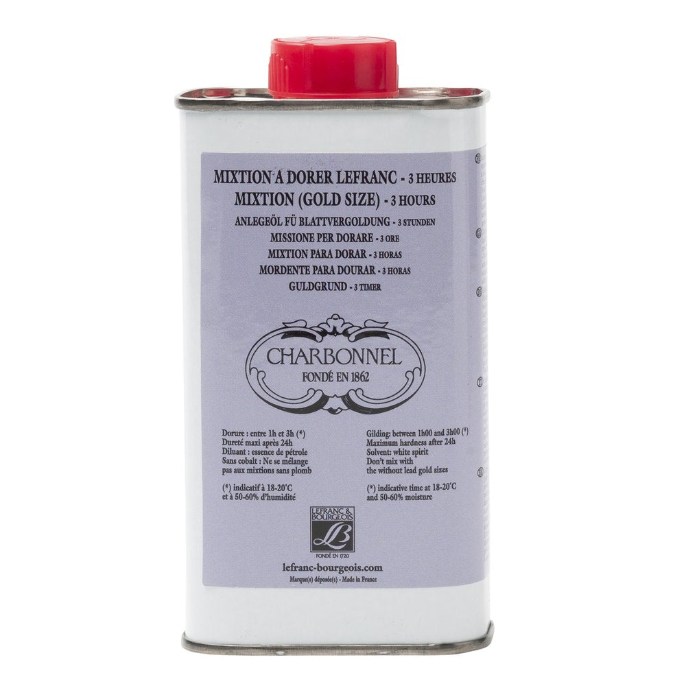 La mixtion à dorer à l’huile est un mélange spécial qui permet de coller la feuille d'or sur des surfaces non poreuses (verre, métal, marbre, etc.) Temps de séchage: environ 3 heures Elle est plutôt employée sur des surfaces moins importantes, pour des travaux d’intérieur, ou lorsque le contexte ne permet pas d’employer la mixtion 12 heures (climat trop humide et taux de poussière important